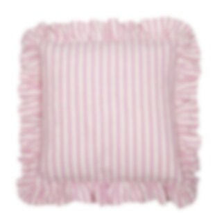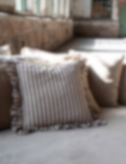 Kuddfodral med klassiska beigea ränder och volangkant, tillverkad av återvunnen bomull och återvunnen polyester.