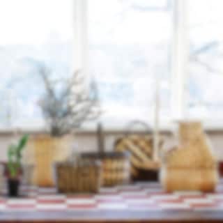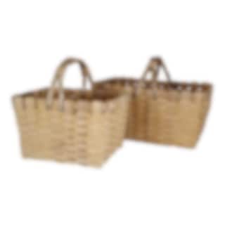 Flätad spånkorg i natur med handtag. Perfekt för svampplockning eller picknick.